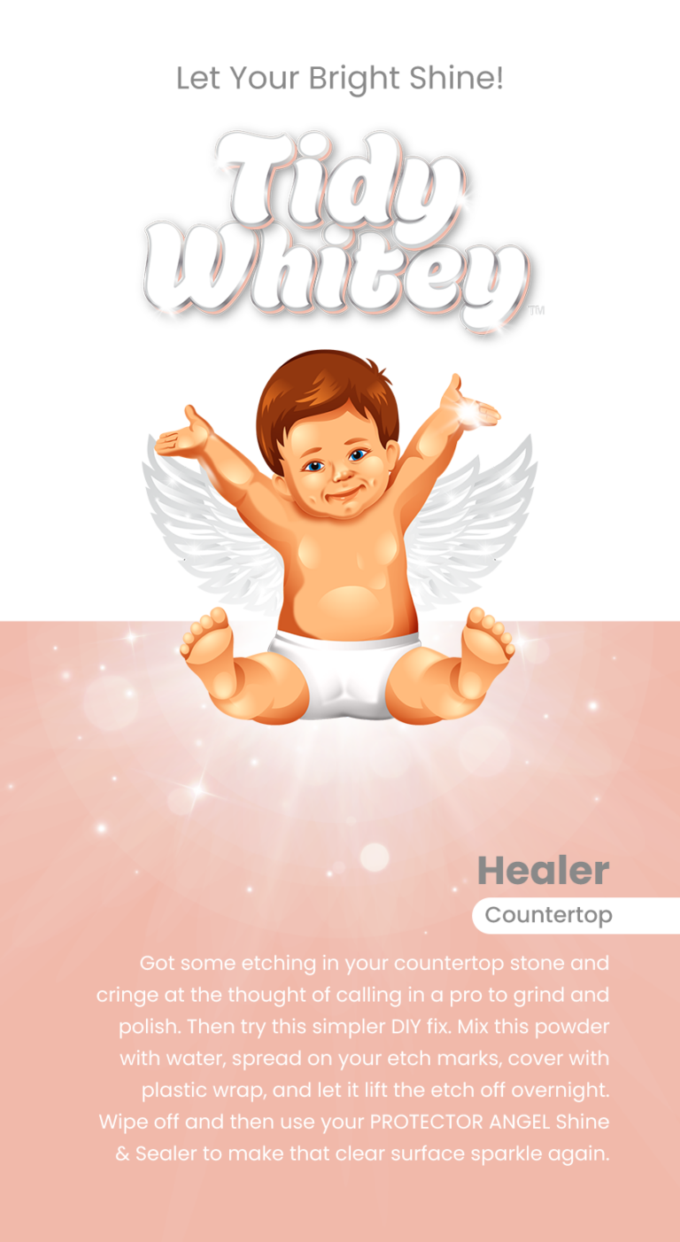 Got some etching in your countertop stone and cringe at the thought of calling in a pro to grind and polish. Then try this simpler DIY fix. Mix this powder with water, spread on your etch marks, cover with plastic wrap, and let it lift the etch off overnight. Wipe off and then use your PROTECTOR ANGEL Shine & Sealer to make that clear surface sparkle again.